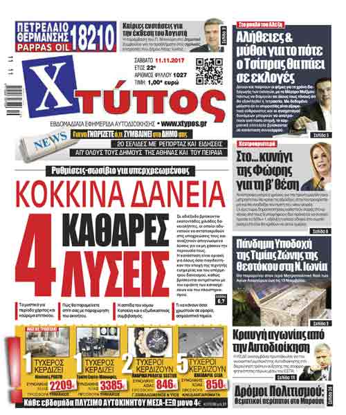 Πρωτοσέλιδο «ΧΤΥΠΟΣ» Σαββάτου 11 Νοεμβρίου 2017