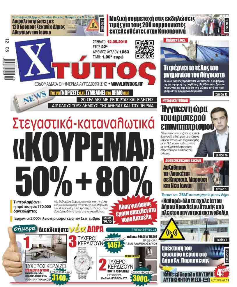 Πρωτοσέλιδο «ΧΤΥΠΟΣ» Σαββάτου 12 Μαίου 2018