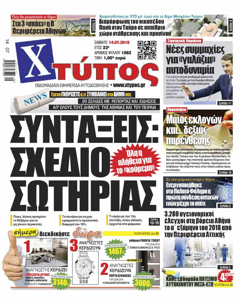 Πρωτοσέλιδο «ΧΤΥΠΟΣ» Σαββάτου 14 Ιουλίου 2018