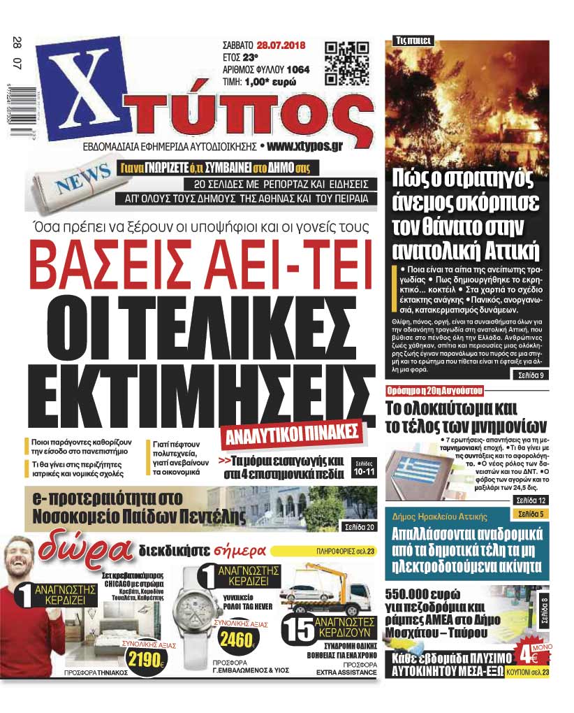 Πρωτοσέλιδο «ΧΤΥΠΟΣ» Σαββάτου 28 Ιουλίου 2018