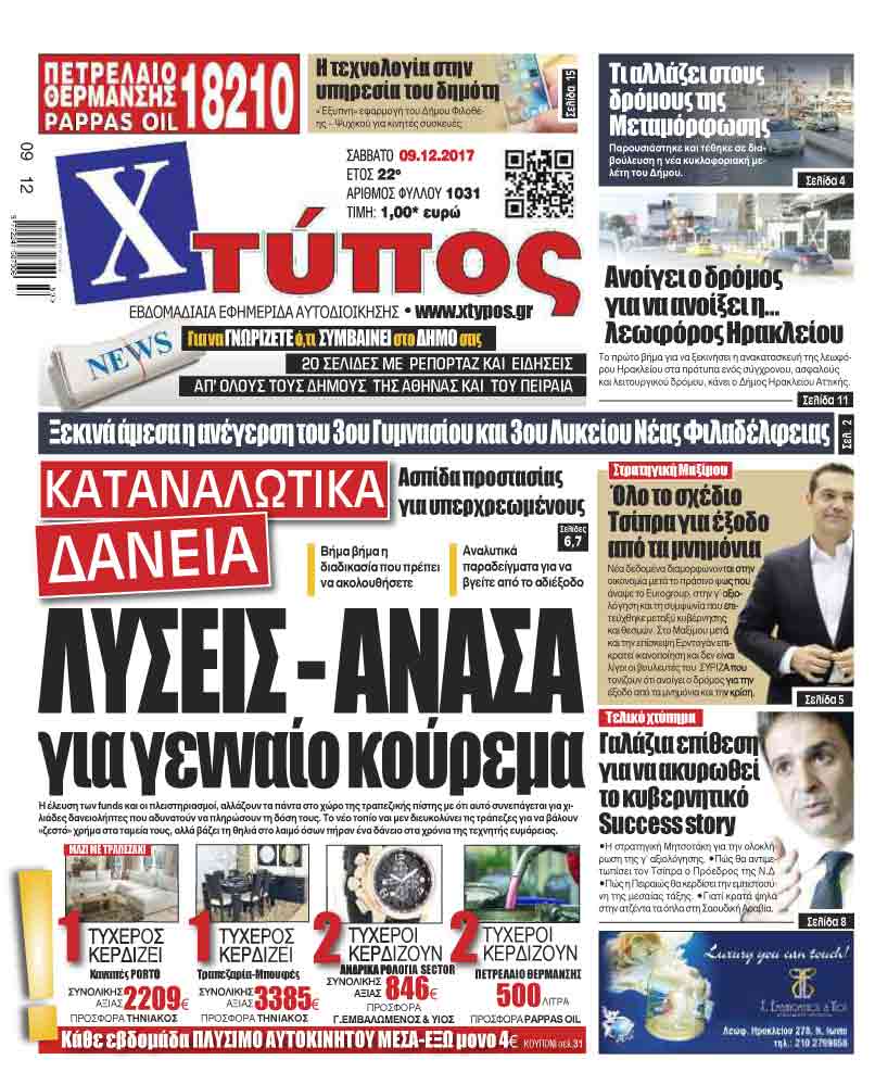 Πρωτοσέλιδο «ΧΤΥΠΟΣ» Σαββάτου 9 Δεκεμβρίου 2017